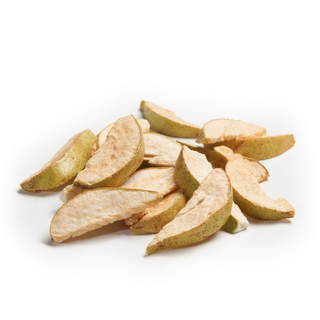 Külmkuivatatud pirn on valmistatud hoolikalt valitud pirnidest. Külmkuivatamine säilitab puuvilja loomuliku maitse ja struktuuri, muutes selle kergeks ja krõbedaks.